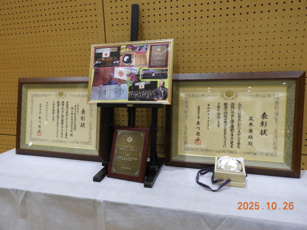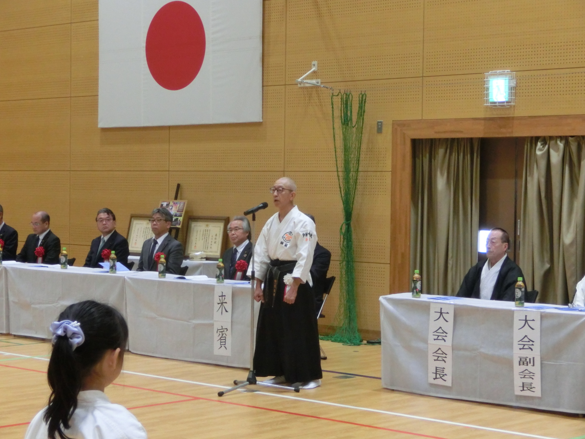 正木本部長は大会会長挨拶の結びに、生涯スポーツ功労者としての個人受賞と一般社団法人 全日本少林寺流空手道連盟 錬心舘広島地区本部の生涯スポーツ優良団体としての文部科学大臣賞の受賞を会場の皆さんに報告され この受賞に誇りと自覚を以って今年の錬心舘のモットー「向上一路」を実践してさらに修行に励みましょうと力強く語られました 。